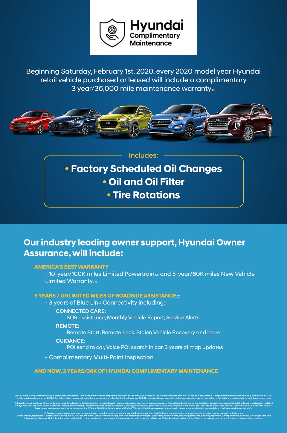 (1) This offer is non-transferable: This complimentary normal scheduled maintenance program is available to the exclusive benefit of the initial purchaser, owner or lessee of a new vehicle. Complimentary Maintenance is only available on MY20 vehicle purchased on or after 2/1/20. Complimentary normal scheduled maintenance provided for the first 3 years or 36,000 miles whichever comes first. See your vehicle's owner manual for a full list of normal scheduled maintenance services.